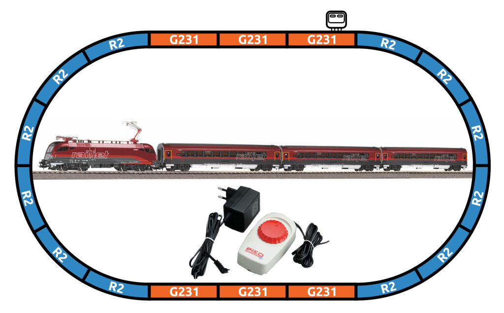 Štartovacia sada súpravy Railjet skladajúca sa z elektrickej lokomotívy Taurus, troch osobných vozňov rôznych tried, predĺženého oválu a analógového ovládania s napájaním. Lokomotívu je možné dovybaviť digitálnym dekodérom. V našej ponuke nájdete aj ďalšie vagóny zodpovedajúceho typu a úpravy. Koľaje s podložím zaisťujú vyššiu odolnosť a životnosť pri opakovanom rozoberaní. Nákup sady je vhodné doplniť o príslušný spotrebný materiál.